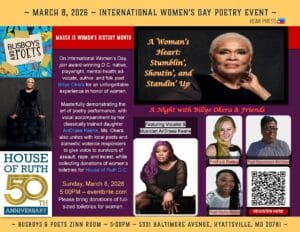Masterfully demonstrating the art of poetry performance, with vocal accompaniment by her classically trained daughter AnDraea Keene, Billye Okera also unites with local poets Aisha Asare, Gwenivere McClain, and Liz Reitzig to celebrate women’s history and give voice to victims of sexual assault, rape, and incest. Other anti-domestic violence advocates representing House of Ruth D.C. will present a video testimonial of survivors and housing solutions, while collecting donations of women’s toiletries.